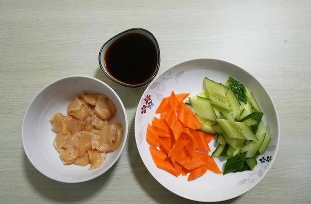 2.將黃瓜和胡蘿卜切片,雞肉切片,放在碗內加入料酒、胡椒粉、少許淀粉拌勻醃制10分鐘,取一碗加入淀粉、鹽、醬油加入半碗水調成汁