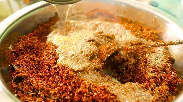 肉醬采用3肥7瘦的豬後腿肉炒制而成,配以精心研磨的辣椒,油潑在上面,香氣四溢。