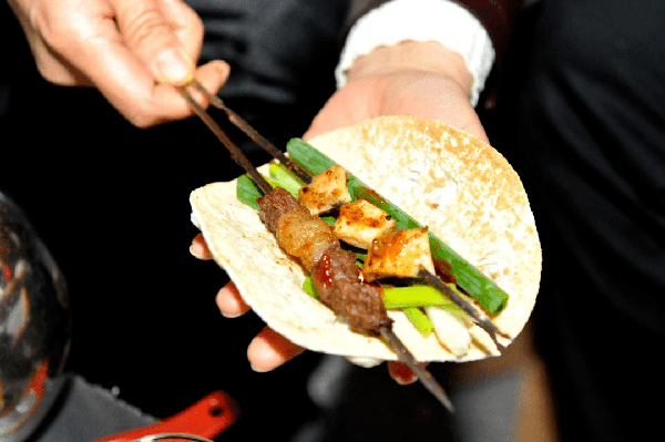 食客用小餅卷起蘸瞭蘸料的肉串和小蔥。烤肉配小蔥卷餅是淄博燒烤的獨特吃法。劉一鳴 攝