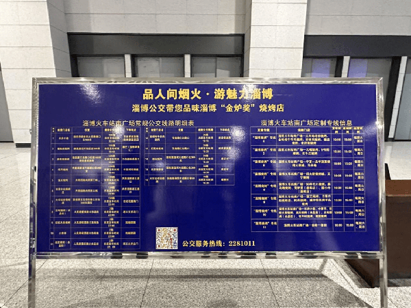 淄博火車站出站口的公交線路指示牌,清晰標明瞭各線路沿途知名燒烤店。新華社記者 張超帆 攝