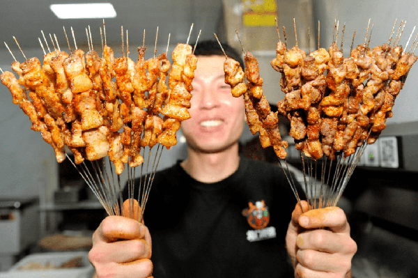 一傢燒烤店的燒烤師傅將烤好的肉串遞給同事。劉一鳴 攝