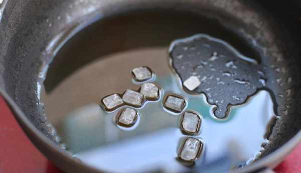 2.將泡發的香菇和胡蘿卜切成小丁,切蔥花、薑絲和蒜末備用。鍋中倒適量食用油燒至五成熱,放入冰糖小火翻炒至冰糖融化