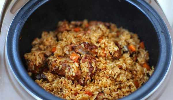 5.將燉好的排骨倒入大米中,按煮飯鍵開始煮飯,煮好後切斷電源將排骨飯翻拌均勻,再蓋上鍋蓋燜十分鐘即可