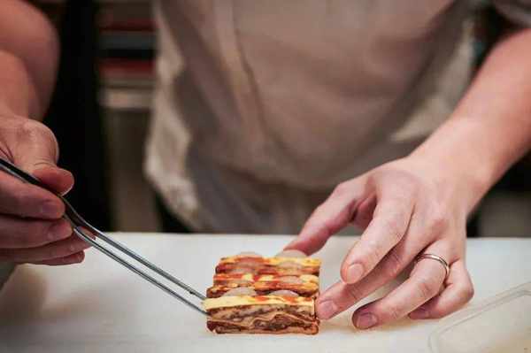 把面皮劃切成漂亮的格紋講究細心。攝影:Tommy Tang