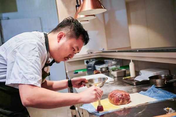 Caleb 為制作惠靈頓牛排塗上蛋液。攝影:Tommy Tang