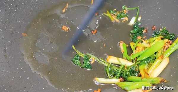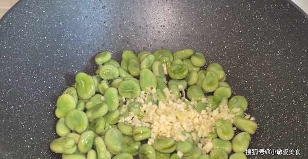 4、鍋裡加油,把蠶豆倒進來,大火翻炒,蒜末也放進來炒香,炒至蒜末開始發黃,把蒜苔加進來,來點鹽調味,加入少許的開水,悶一會,把蠶豆充分的燜熟,燜入味。