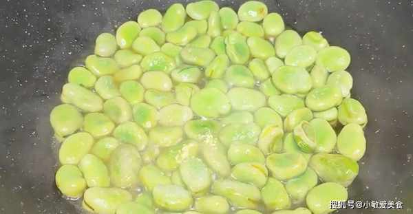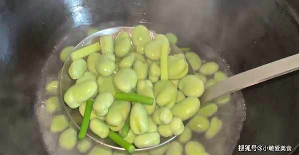 3、鍋裡加水燒開,加一勺食鹽和幾滴食用油,把蠶豆下鍋焯水,煮至斷生就可以撈出來瞭。撈出立即過冷水。這新鮮的蠶豆,我們在烹飪的時候一定要充分的煮熟。這一步非常重要,不能吃沒有熟的蠶豆,不介意的可以直接把蠶豆過油,那樣比直接焯水口感更好。