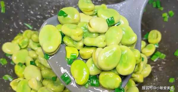 6、再把蠶豆倒入鍋中,開大火,把蠶豆翻炒一下,把蠶豆炒香,加入一點點的清水,下面來調個味,隻需要加入一點食鹽,一點雞精,把調料都攪至融化,大概翻炒30秒鐘過後,把蔥花倒進來,炒出蔥花中的香味,翻炒十秒鐘左右就可以關火出鍋瞭,下面裝入盤中就可以美美地開吃瞭。