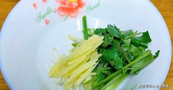 2、下面準備一點小料,小蔥先用刀拍一拍,這樣更容易出味。最後再切成小段,切好之後放入小碗裡面,香菜同樣切成小段,切好之後放入小碗裡面,生薑切成薑絲,切好之後與小蔥、香菜放入一起,剩下的蔥葉再切成蔥花,這個我們出鍋的時候用,切好之後放入小碗裡面。
