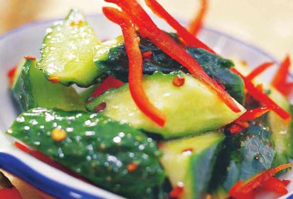 材料:小黃瓜1000克,紅辣椒100克,大蒜30克,精鹽、白糖、辣椒粉各2大匙,白醋各1大匙。