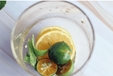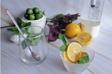 第二步:檸檬,青桔,3-5片薄荷葉放在杯子裡壓出汁,對著它們一頓“暴打”~檸檬和青桔都比較好弄,主要是懟薄荷葉。不要把檸檬片懟爛瞭…不然不好看哈哈