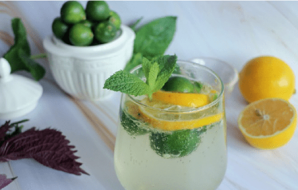第三步:倒入蘇打水,攪拌均勻。檸檬和青桔會浮起來,這個時候放上薄荷葉裝飾。一杯清新的蘇打水就完成瞭,怎麼樣 是不是好喝又好看?