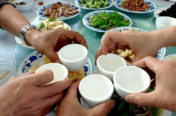 當客人來的時候,他們坐在酒缸周圍的方形凳子上,以氣缸蓋為桌子,把白酒和蔬菜放在桌子上,邊吃邊聊。