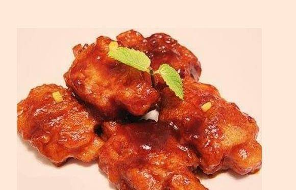 接著我們將炒菜鍋上火燒熱,倒入花生油燒至八成熱,下入“排骨”炸成淺黃色,倒入漏勺。鍋內我們留少量底油,下入勾芡的汁,待汁變濃,下入炸好的排骨,翻炒使汁裹附在排骨上即成。