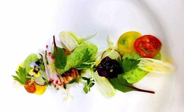 把醃制好的三文魚扒至八成熟擺入盤中,放入醃制好的藕帶和櫻桃蘿卜,打入菠菜刁草泡沫、小番茄、菜心和食用花草裝飾,把蘋果醋檸檬汁和橄欖油混合撒在菜上即可