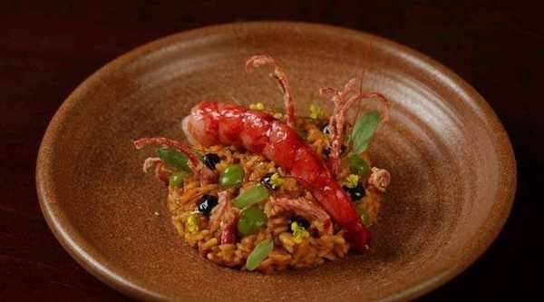 紅蝦1隻、香草棍四分之一個、檸檬皮適量、意大利米50克、白洋蔥10克、墨魚10克、海鮮湯200毫升、熏紅椒粉1小勺、黑蒜醬10克、歐芹蒔蘿醬10克、白葡萄酒適量、海鹽少許、黑胡椒粉少許