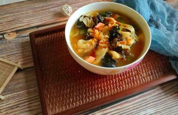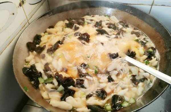 11、將麻食加入到開始的湯鍋中,加入適量的鹽、雞精、醋和黃豆醬煮2分鐘。
