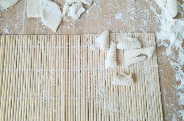 9、用一個壽司卷,將每個面團放在上面搓一下,搓成麻食形狀,這個過程需要有一些耐心哦。