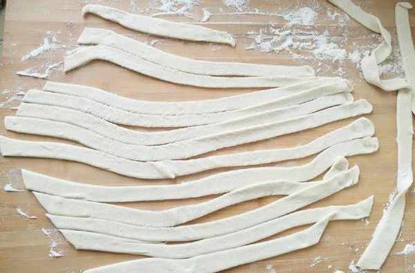 7、將醒好的面團搟成薄片,用刀切成小長條。