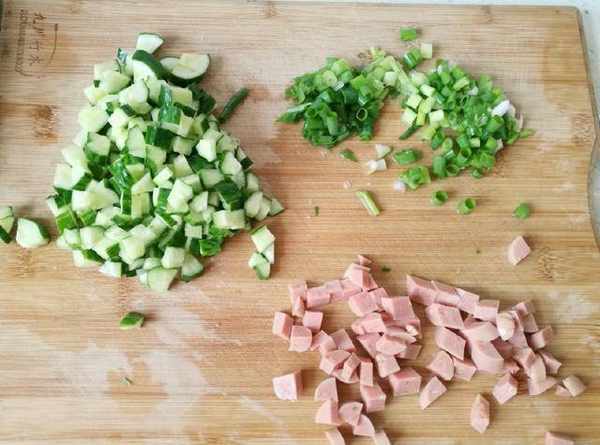 4、黃瓜切成小丁狀,火腿切成小丁狀,小蔥切成小段。