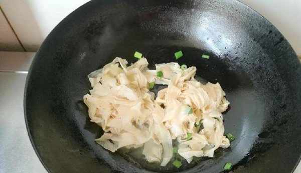 5、鍋中放油,將小蔥放入一小部分炒出香味後,加入廣肚片炒勻。