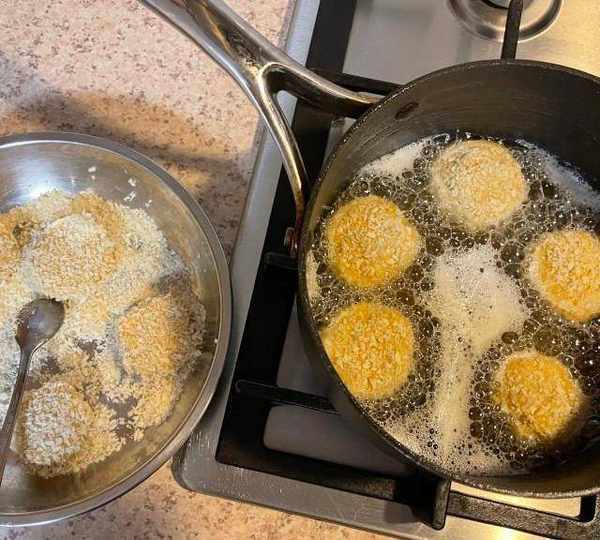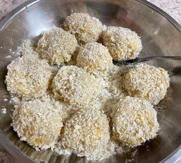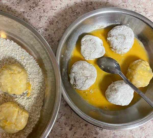 第8步、裹上面包糠。用勺子從底部小心翻動。