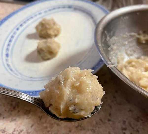 第4步、冷藏過的肉末更硬些,容易整型成丸子狀。最簡單做法,用勺子挖,每挖完一粒,就用冷水沖一下勺子,防止粘黏。