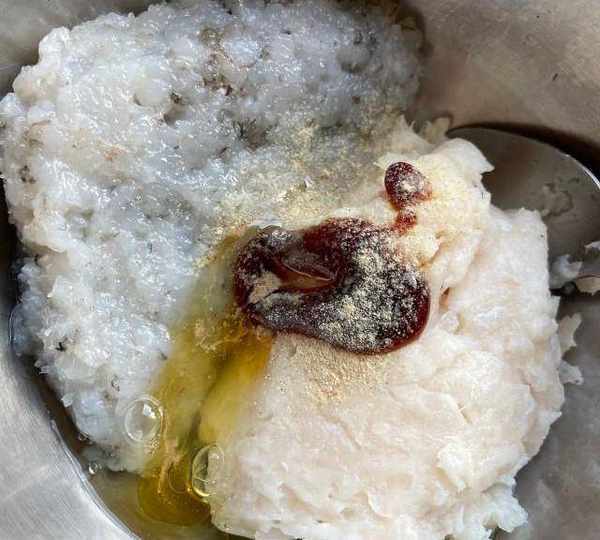 第2步、加入半個蛋白。加入適量蠔油,麻油,胡椒粉,鹽。