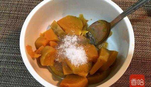 2.蒸好的南瓜趁熱加入白糖攪拌均勻