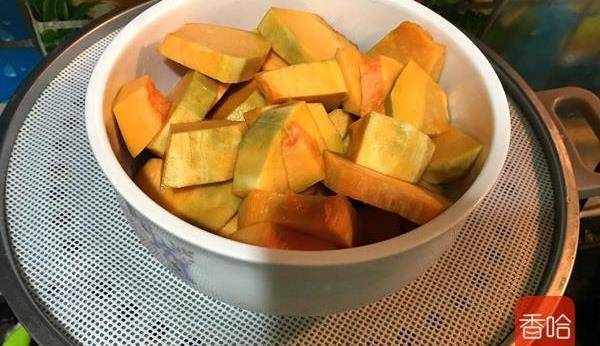 1.南瓜去皮洗凈切成小塊放入蒸鍋蒸熟