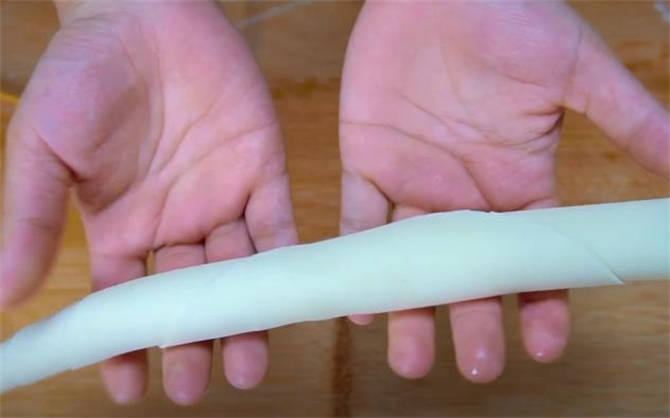 3.案板上撒一些幹粉,把小面劑按扁,搟成一張薄的餅皮,表面刷一些油,一邊放一根筷子,卷起來。