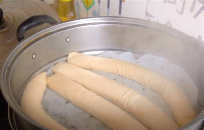 5.鍋內上汽之後,把這些面條放進去蒸十分鐘,時間到瞭,咱們這個面皮就蒸好瞭。
