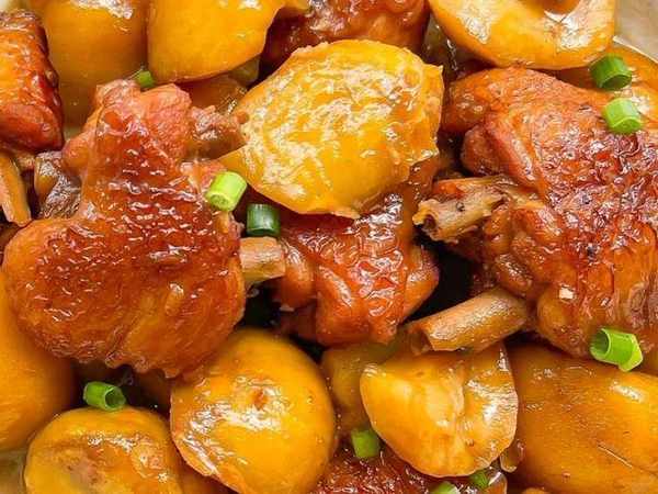 2、起鍋燒油,油熱後放入冰糖翻炒一會兒,炒出棗紅色糖色後,放入雞中翅翻炒均勻上色。再加入醬油、板栗仁和適量熱水沒過食材,蓋上蓋子燜煮半個小時。