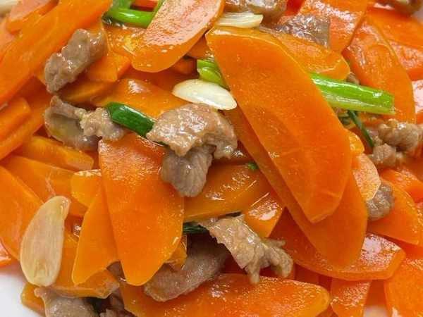 1、瘦肉清洗幹凈切成片,加入食鹽、料酒、生抽、淀粉、食用油,抓拌均勻醃制十分鐘。胡蘿卜削掉外皮,清洗幹凈後切成片。