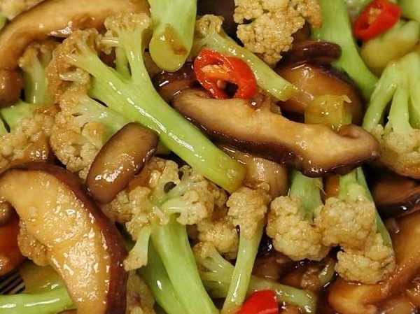 3、起鍋燒油,油熱後放入蒜末和小米辣爆香,再放入香菇翻炒一會兒,炒軟後放入花菜翻炒均勻,加入生抽、蠔油調味,翻炒均勻入味即可出鍋開吃。