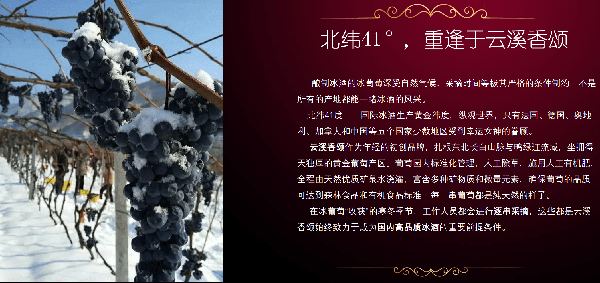 雲溪香頌還表示: 冰酒相當於葡萄酒更高更深層次的釀造,因而 冰酒比葡萄酒要濃香和濃甜,幾十斤冰葡萄才能出1瓶冰酒,是實實在在的品質,我們的冰酒在市場上有口皆碑 ;我們 對中國未來的冰酒市場更有信心,為中國冰酒產業能夠貢獻一份力量;我們始終熱盼 和中國酒業的同仁們一起為國酒發揚、爭光。