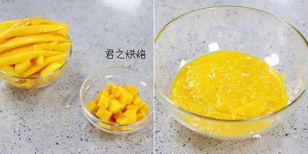 將切成大塊的芒果和細砂糖混合(另外留一點小塊芒果丁用來成品裝飾),用食品料理機或破壁機攪打成為芒果泥,冷藏備用。