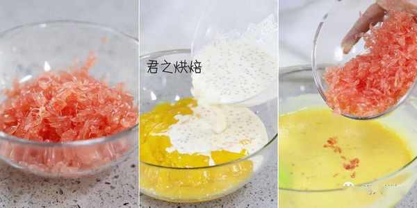 3、西柚本身的味道偏酸偏苦,但用在這道甜點裡可以很好的中和甜品本身的甜膩感,而且紅心的西柚裝飾在表面也會讓這道甜品顏值更高。如果你買不到西柚,用普通柚子代替也可以。