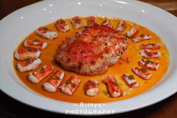 帝王蟹兩吃:一吃為花雕芙蓉蒸帝王蟹腳,去殼的帝王蟹腳放像花一樣擺放,在蟹腳上還放上瞭魚籽,連同蒸蛋和蟹腳一同放入口,鮮嫩中帶著蟹籽的鮮,口感特別豐富。