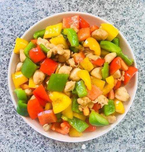 ③熱鍋加入少量的油,放入幹辣椒和花椒,用小火煸香,出香味後下雞丁,快速翻炒,炒到雞肉顏色發白後倒入彩椒,翻炒幾下,倒入之前剩下的一半料汁,然後大火猛炒,直到收汁即可出鍋瞭。
