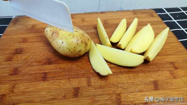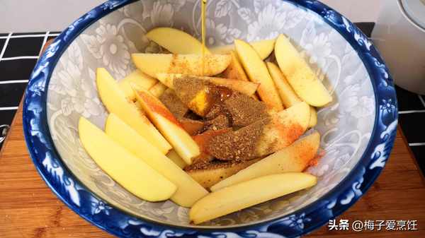 清洗幹凈以後,將它從中間切開一劈八瓣,全部切好以後放入大碗中,依次倒入食用鹽,兩勺麻辣鮮,一勺孜然粉,一勺燒烤蘸料,最後少來一點點的食用油,將它攪拌均勻,讓每一塊土豆上都沾勻蘸料。