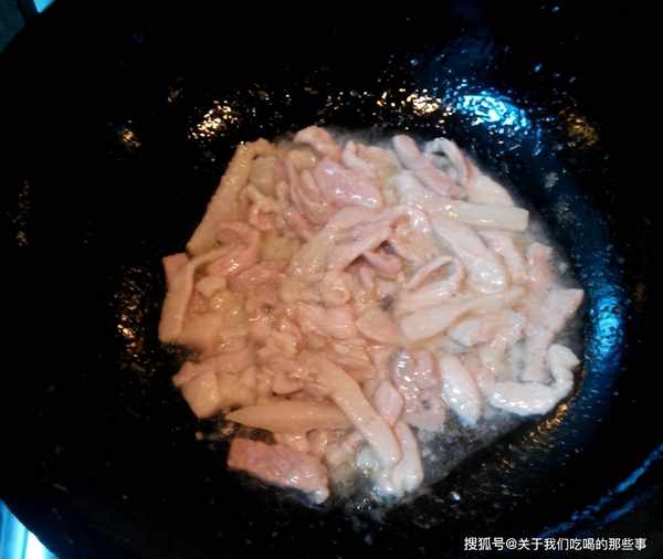 3、生薑切絲,起鍋燒油,倒入醃好的肉絲滑炒一會兒,變色後盛出。鍋裡留底油,放入薑絲爆香,倒入焯過水的木耳、蒜薹,大火翻炒一會兒。