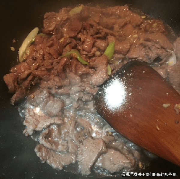 3、牛肉片變色後,倒入炒好的大蔥,加入適量食鹽、生抽、雞精調味,翻炒均勻即可出鍋,肉質鮮嫩,美味可口。