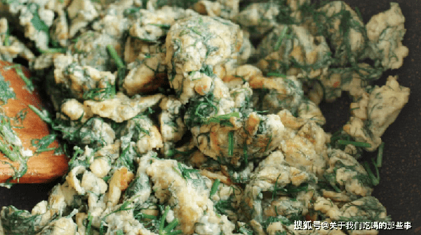 2、起鍋,倒入適量油,大火燒至八成熱,倒入茴香雞蛋液,繼續大火煎一會兒,雞蛋液凝固後用鏟子炒成大快,顏色焦黃後即可出鍋。