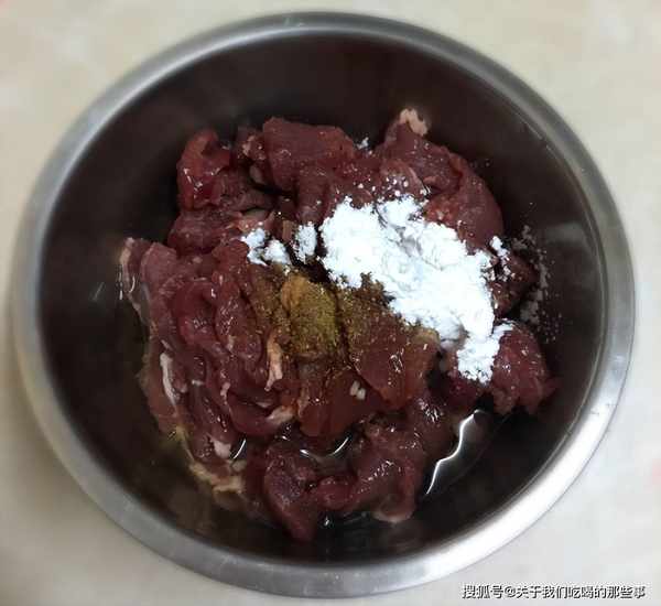 1、牛裡脊洗幹凈,切成薄片放入碗中,加入食鹽、料酒、生抽、蠔油,用手抓拌均勻,再打入一個雞蛋清、一勺淀粉,加一勺食用油拌勻,醃制20分鐘。