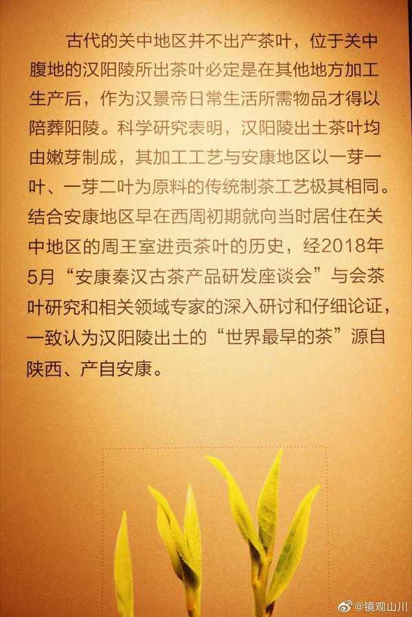 2016年5月,吉尼斯世界記錄認證,漢陽陵出土的茶葉是迄今(距今2150 年)為止發現最古老的茶葉,這個“世界最早茶葉” 源自陜西、產自安康。