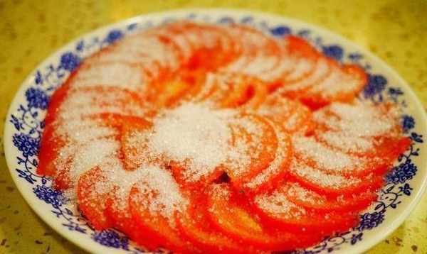 吃西紅柿加糖的話,除瞭白砂糖外,還要多撒一點,比隻加糖更甜