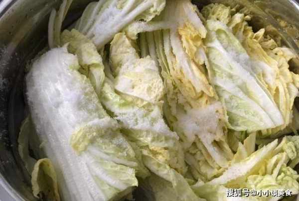 第三步:將鹽攪拌均勻後,把白菜放在一邊醃4小時左右。白菜醃好後,先瀝幹水分。瀝幹後,先倒少許醋。充分攪拌使卷心菜變香,然後加入辣椒調味。加入辣椒後,白菜變得酸辣,和米飯很相配。