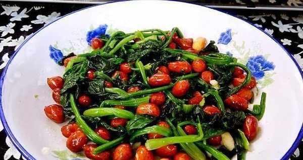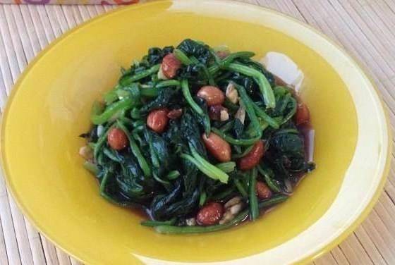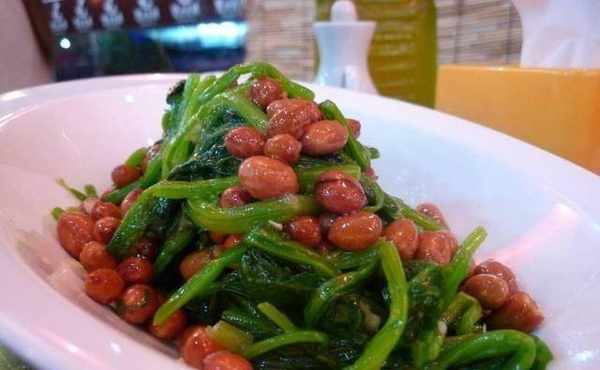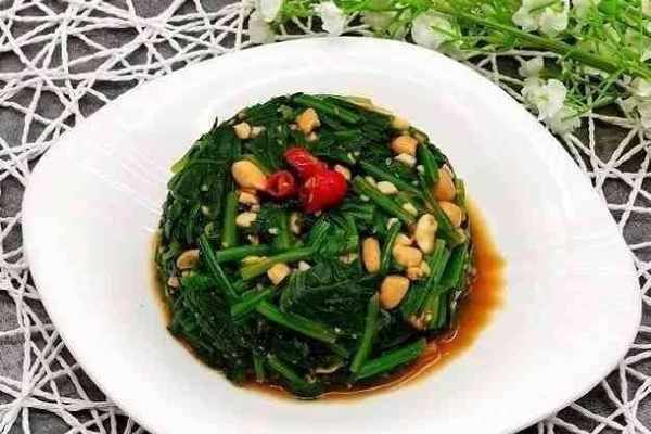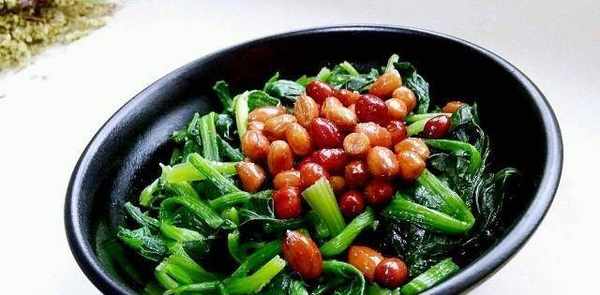 鍋中放少量油,然後用冷油將花生仁炒熟。小火炸至堅果爆裂,然後倒掉油,瀝幹待用。然後準備一個大碗,放入炒好的花生米和焯過水的菠菜,加入準備好的蒜末、香醋少許、醬油、鹽、香油和糖拌勻即可食用。