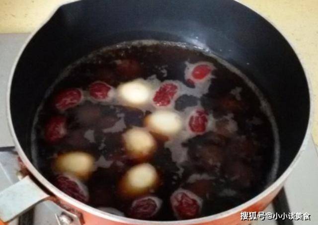第四步:待紅糖完全煮熟後,將提前煮好去皮的鵪鶉蛋放入鍋中。一定要提前煮熟,然後去皮下鍋,這樣鵪鶉蛋才能充分吸收營養,吃起來也會比較多,等鵪鶉蛋煮熟變色後就好瞭